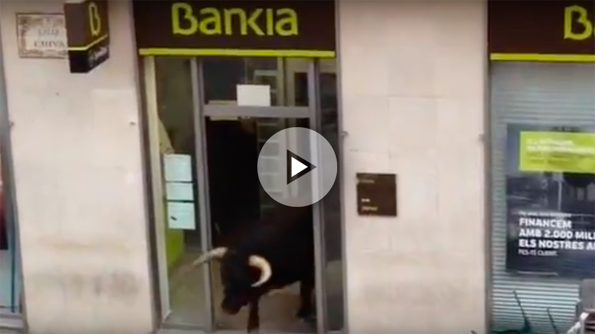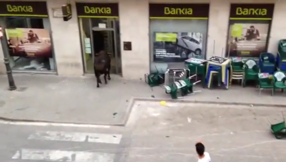 VALENCIA – YOUTUBE Toro in fuga entra in banca. Durante la tradizionale corsa dei tori che ogni anno si tiene a Cheste nella comunità autonoma Valenciana, il grosso animale è entrato in una filiale della banca Bankia, tra gli applausi della gente che subito dopo è corsa all’interno per vedere cosa stia combinando il toro all’interno.