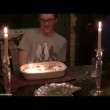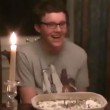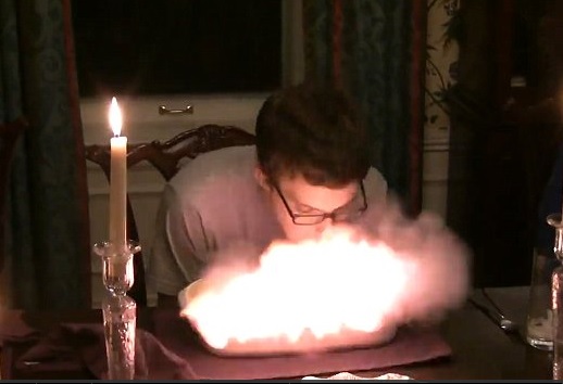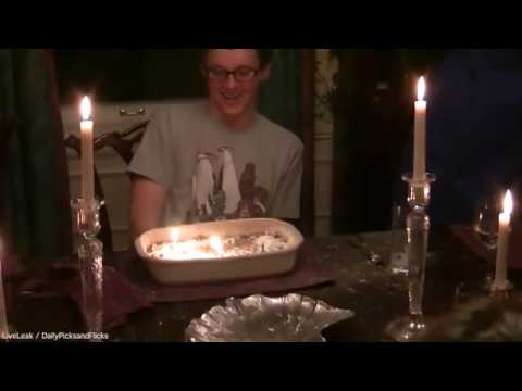 Il giovane si trova con la torta affumicata e resta fermo e impassibile. Quella che sembra la madre lo vorrebbe far spostare avendo forse paura che prenda fuoco di nuovo. I presenti alla cena ridono divertiti. Che sia stato l’alcol magari presente nella torta il responsabile delle fiamme?