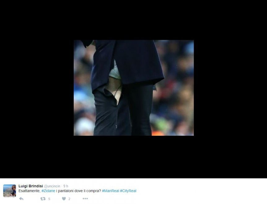 MANCHESTER – Qualcuno cambi taglia o tessuto dei pantaloni di Zinedine Zidane. Per la seconda volta di fila, infatti, l’allenatore del Real Madrid finisce una partita di Champions League con le mutande ben in vista. Era già accaduto durante la partita di quarti di finale contro il Wolfsburg, è accaduto di nuovo nella semifinale di Manchester, pareggiata 0-0 dal suo Real.