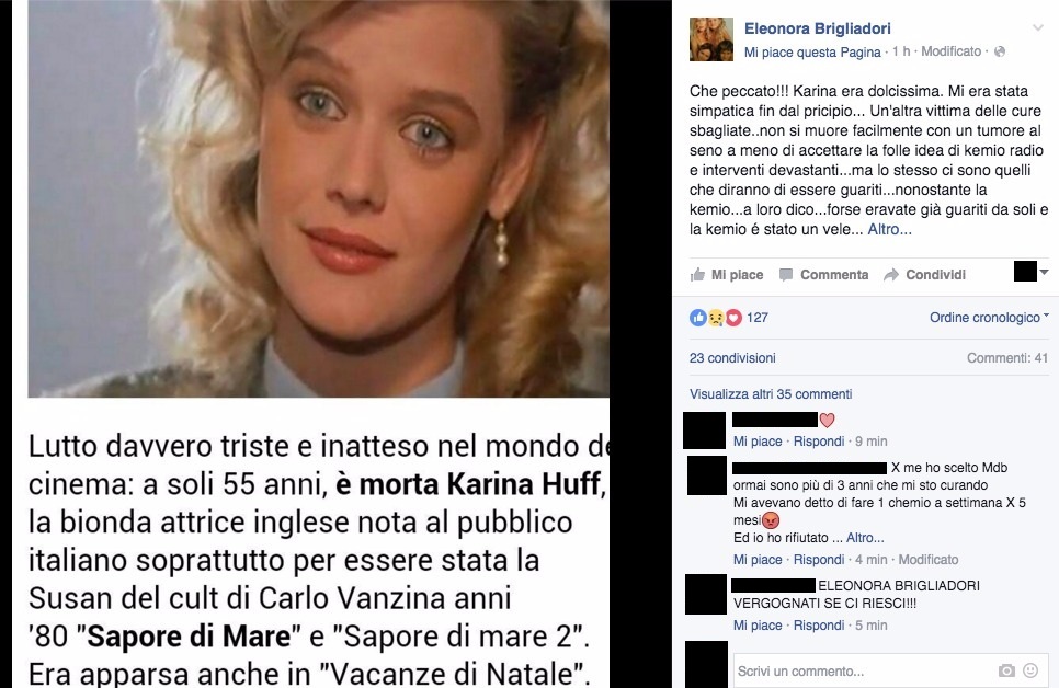 ROMA – È morta Karina Huff, attrice inglese diventata famosa in Italia per aver interpretato il ruolo di Susan nei due film cult degli Anni 80 Sapore di mare di Carlo Vanzina. Carrina Corona Elizabella Huff, questo il suo vero nome, aveva 55 anni e nel 2013 era tornata in tv a Pomeriggio Cinque per parlare anche della sua dura battaglia con un tumore. Era rientrata a Londra, sua patria d’origine, dove insegnava letteratura inglese e stava combattendo una battaglia contro un tumore al seno.