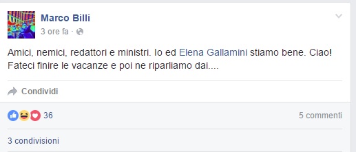 “Amici, nemici, redattori e ministri. Io ed Elena Gallamini stiamo bene. Ciao! Fateci finire le vacanze e poi ne riparliamo dai….”.