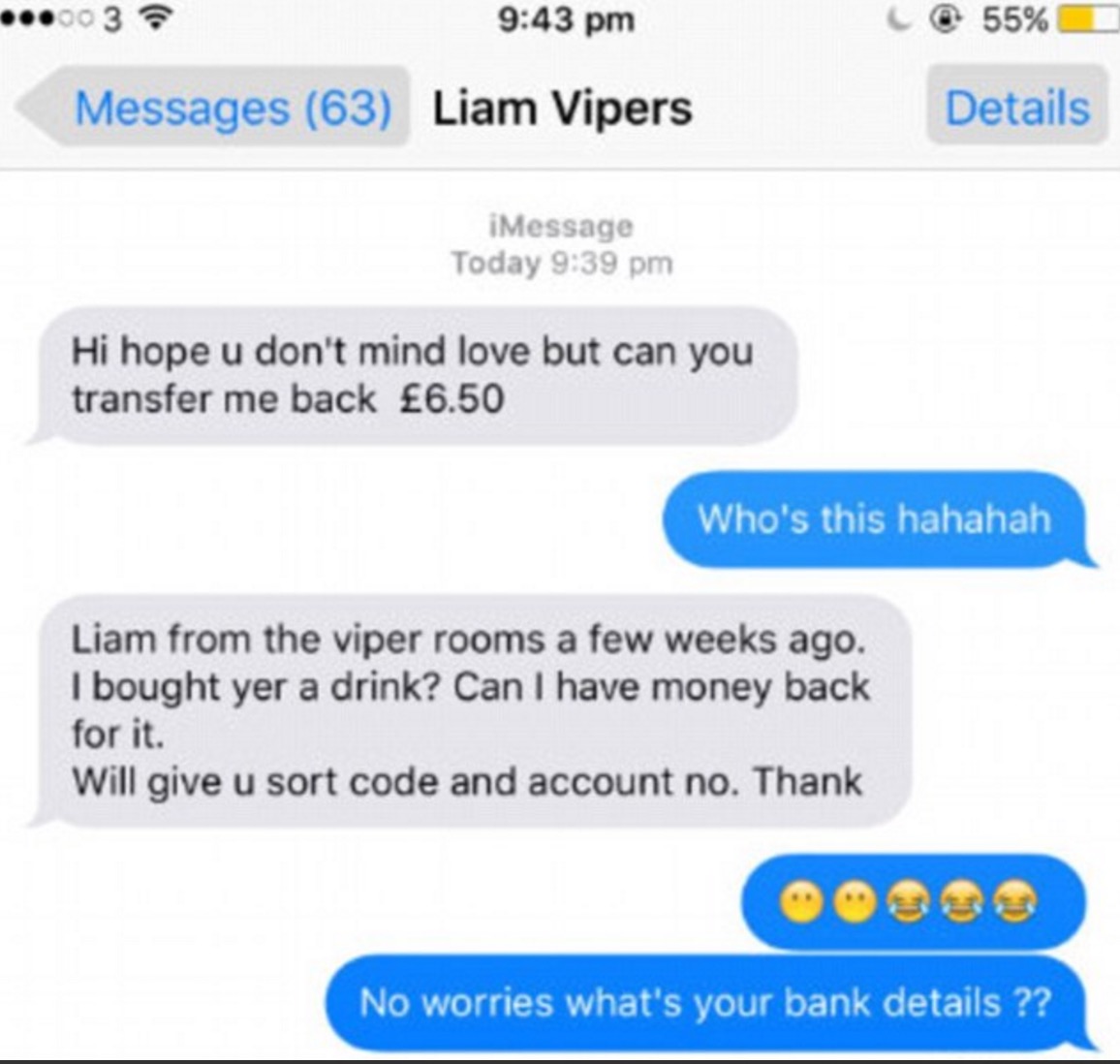 Pochi giorni dopo, infatti, Abby ha ricevuto un messaggino su Whatsapp in cui Liam le chiedeva indietro i soldi del drink. Lei prima è rimasta basita, e poi gli ha risposto affermativamente, pensando che forse quei soldi gli possano servire davvero: “Io osservo sempre le scarpe delle persone e ricordo che lui ne indossava un paio di Primark (una marca britannica low cost di abiti e scarpe, ndr), così probabilmente quei soldi gli servivano”.