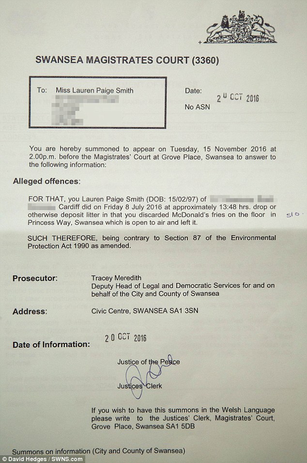 La giovane ha rifiutato di pagare la multa, che nel frattempo è aumentata a 100 sterline, e ora è stata citata dal tribunale di Swansea accusata di aver lasciato spazzatura in strada, come vuole la legge sulla protezione ambientale.