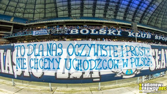 Non sono solo ultras, basta guardare le tribune: una diserzione di massa. Con il pretesto di un pallone che rotola marcano il territorio, chiudono i confini, difendono la razza, discriminano per credo religioso: “E’ semplice e ovvio per noi. Non vogliamo rifugiati in Polonia”, si legge nel grande striscione di Poznan in una partita precedente.