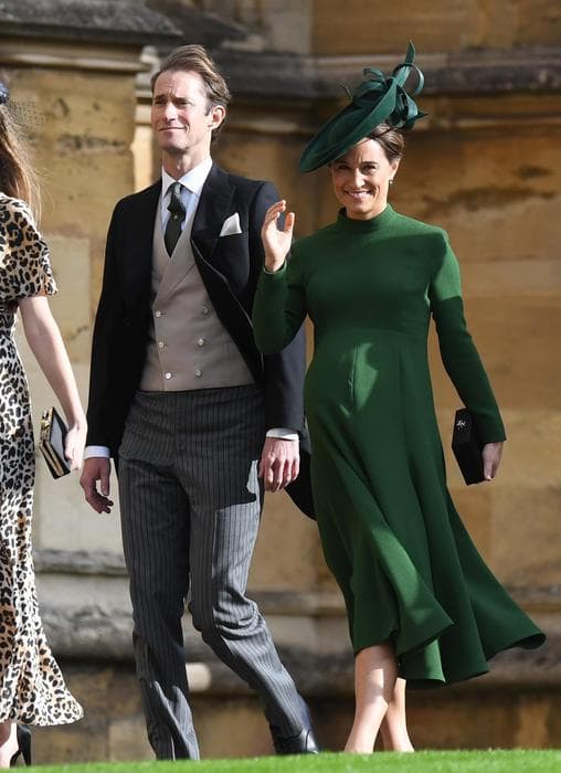 In una giornata ventosa, con qualche cappello che ha rischiato di volar via, la sposa ha sfoggiato un sobrio abito bianco disegnato dagli stilisti britannici Peter Pilotto e Christopher De Vos: leggermente ‘off the shoulders’, con una tiara ricevuta dalla regina decorata da un grande zaffiro, ma senza velo.