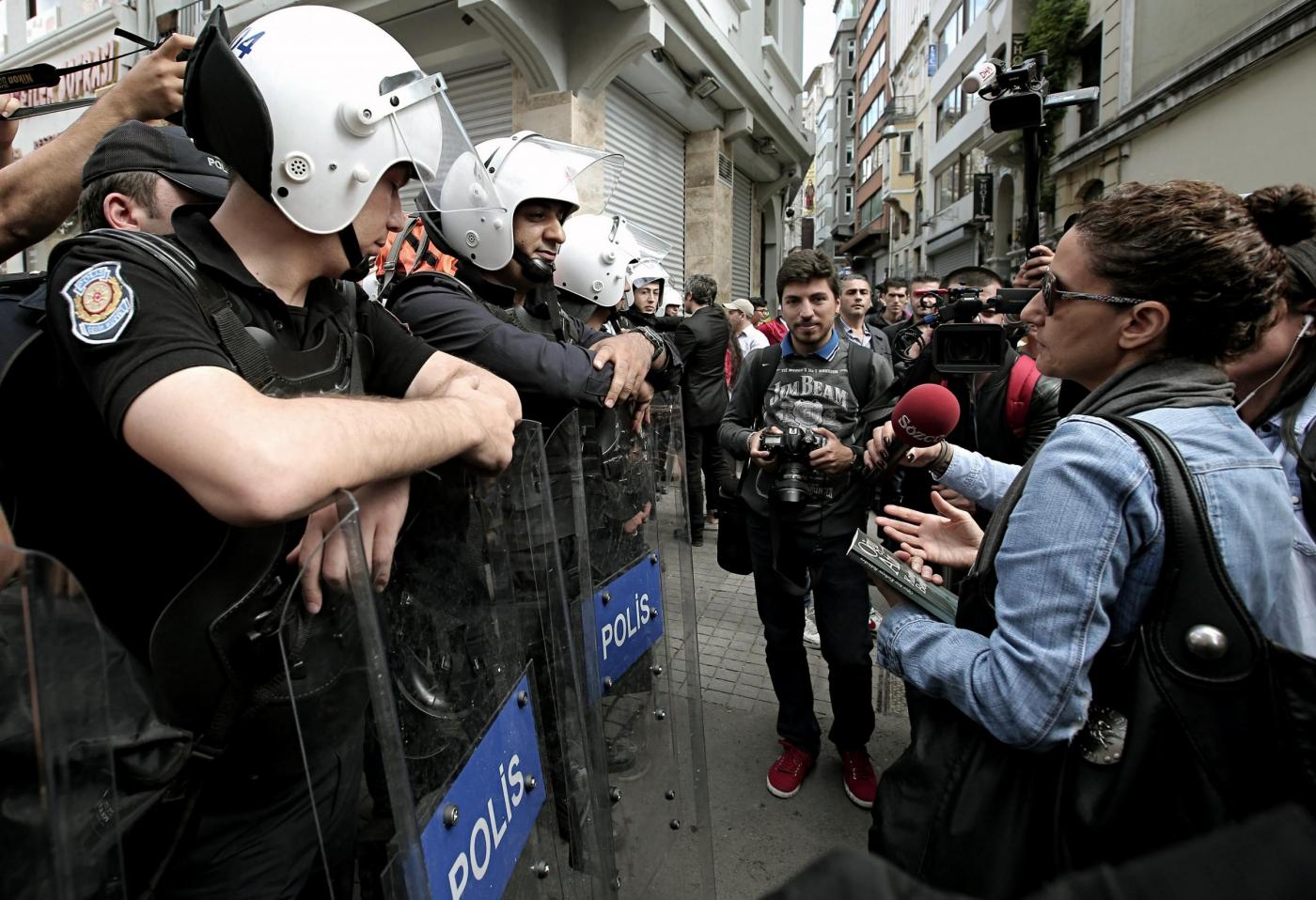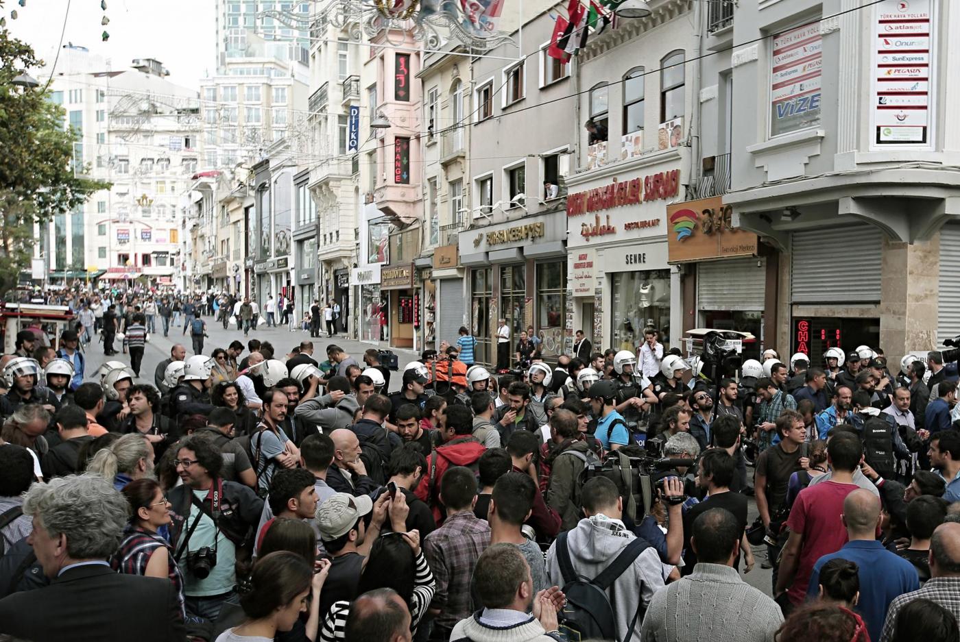 Alcune centinaia di manifestanti sono circondati da un imponente dispositivo di polizia su Viale Istiklal, la celebre via della movida di Istanbul accanto a Piazza Taksim, sulla quale plana una nuvola bianca grigiastra.