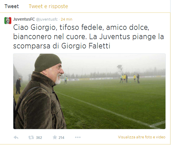 “Ciao Giorgio, tifoso fedele, amico dolce, bianconero nel cuore. La Juventus piange la scomparsa di Giorgio Faletti”.