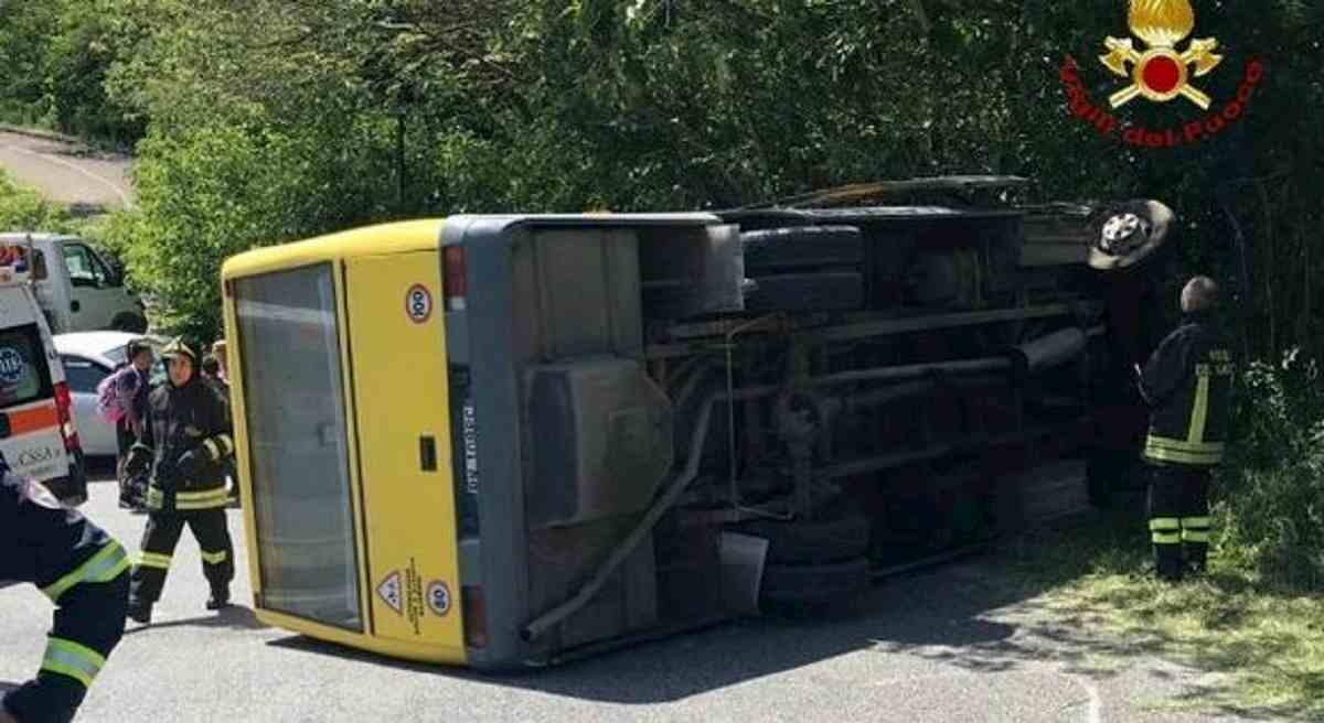 Lo scuolabus dopo l'incidente (foto Ansa)