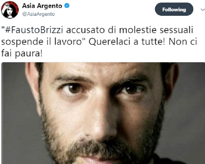 “Querelaci a tutte, non abbiamo paura”: questo tweet (con tanto di errore grammaticale) di Asia Argento sembrerebbe confermare quanto si sta dicendo in queste ore di Fausto Brizzi. Il nome del regista è stato accostato a quello del cosiddetto “Weinstein italiano”, quello che alcune attrici hanno denunciato (non facendone però il nome) come autore di molestie e avances ai loro danni.