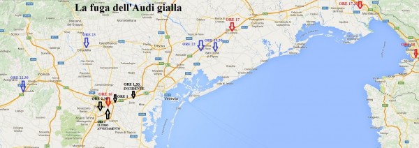 Durante la caccia all’Audi gialla con targa svizzera ci sono state diverse segnalazioni. Come spiegato già nel gennaio scorso da Giordano Biserni, presidente dell’Asaps, l’associazione amici polizia stradale, i tre a bordo, se verranno rintracciati non subiranno grandi conseguenze. Perché quando li prenderanno, denunciava a Repubblica il presidente dell’Asaps, sarà difficile dimostrare che erano loro alla guida di quella Audi gialla durante quei giorni. L’auto ha compiuto fra l’altro un’ inversione di marcia proseguita con una fuga in contromano sul passante di Mestre verso la A4, in direzione Milano, costata la vita ad una donna alla guida di un’auto.