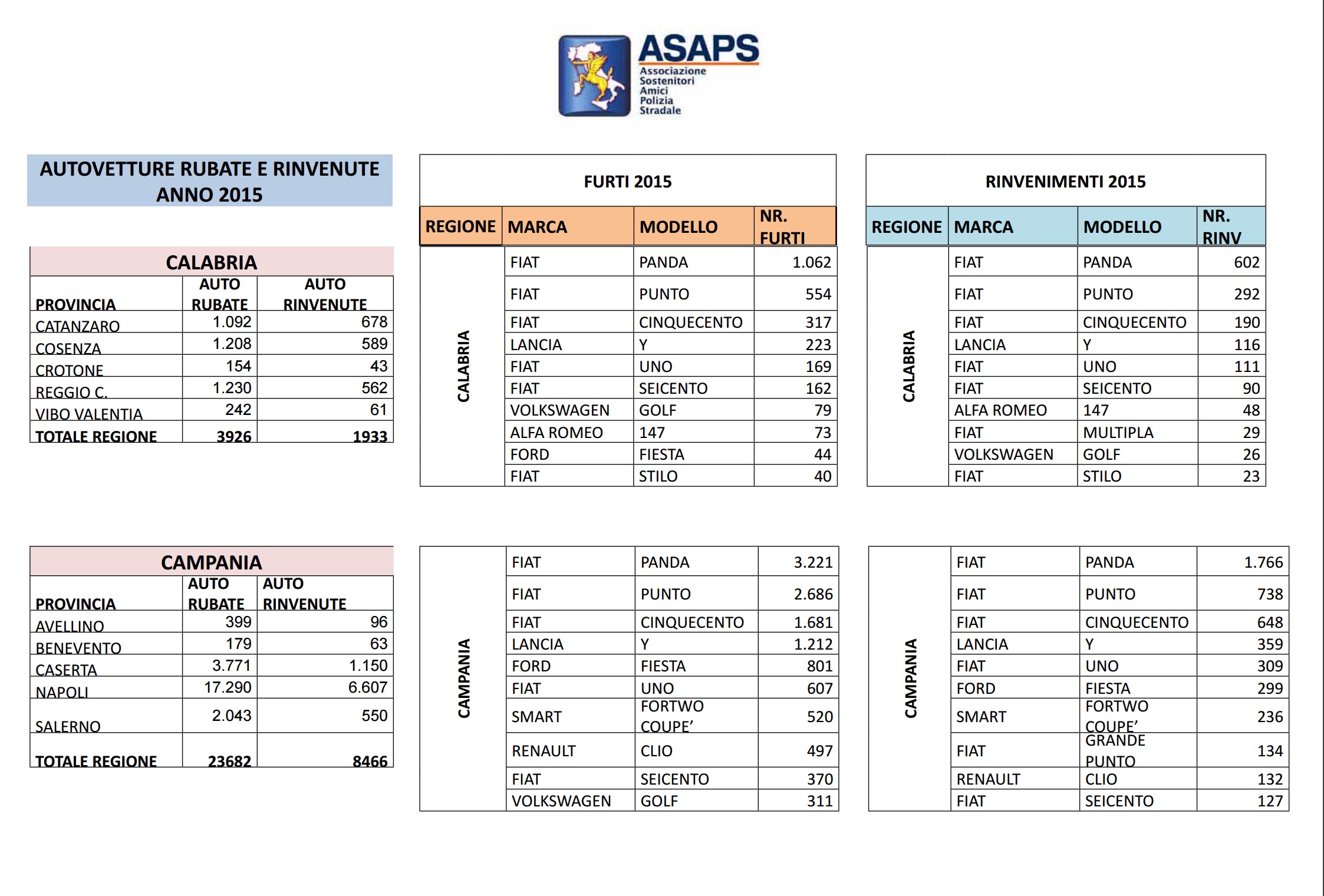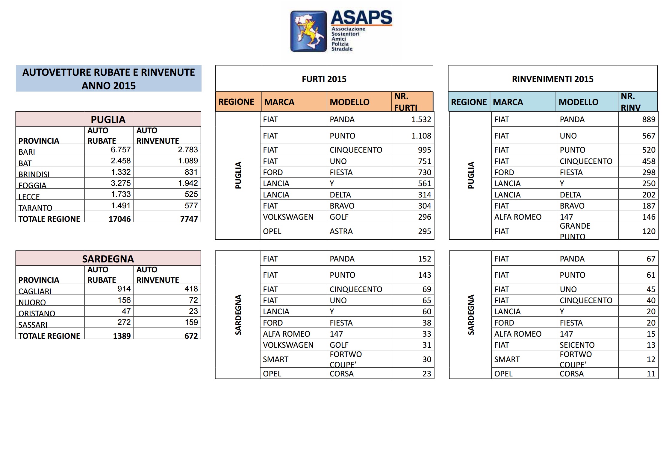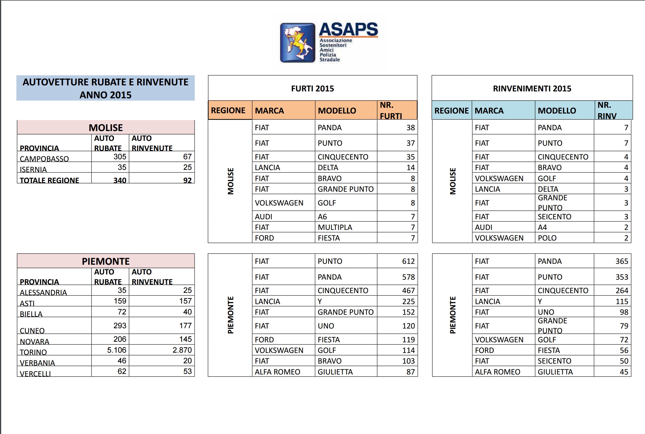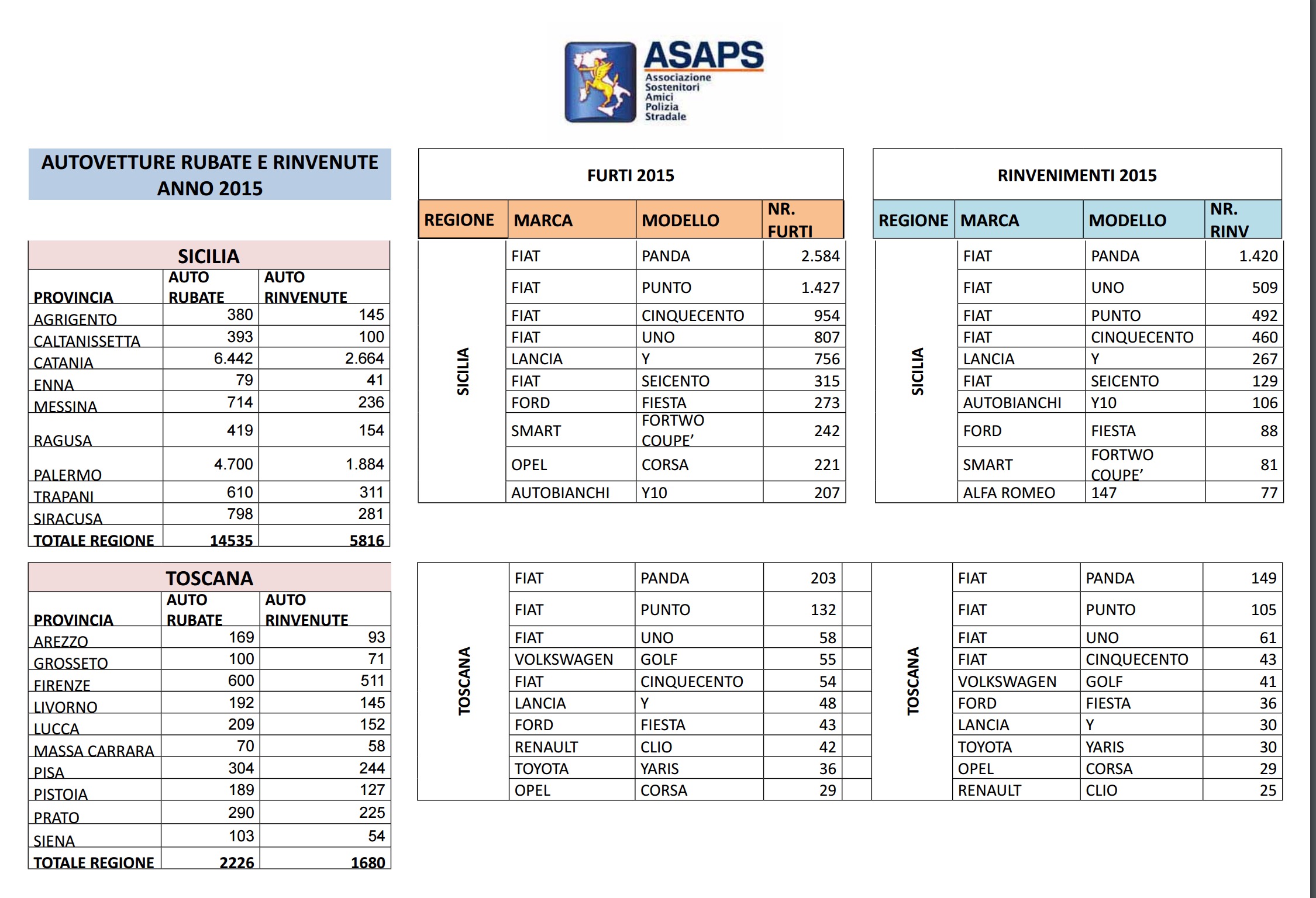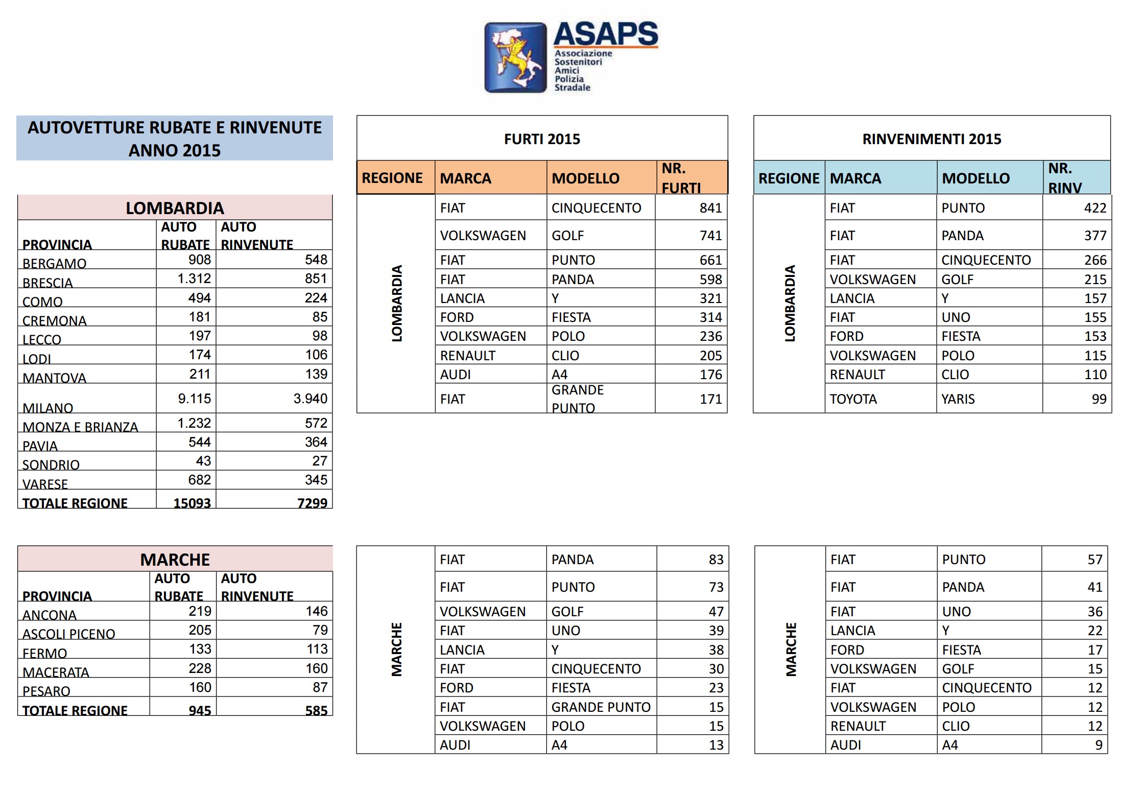 Clicca per saperne di più: Statistiche Asaps sulle auto rubate nel 2015: regioni, città, modelli e marche – Auto rubate in Italia nel 2015: i dati complessivi Asaps