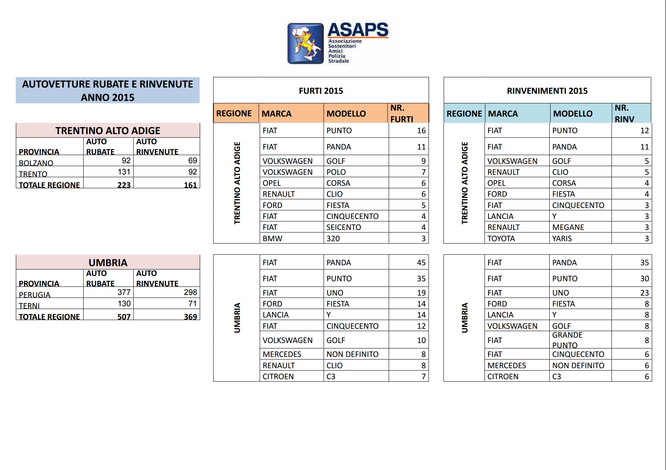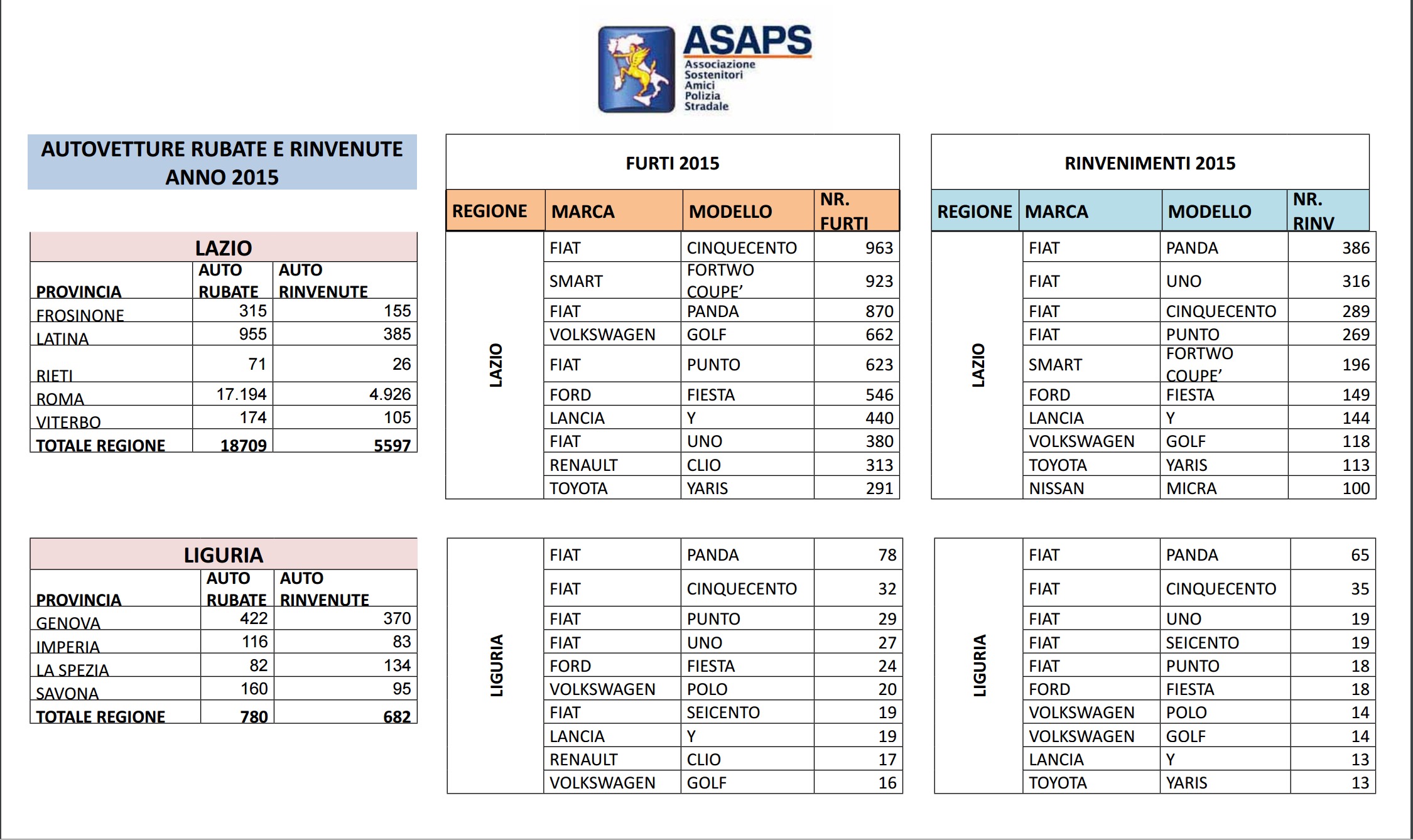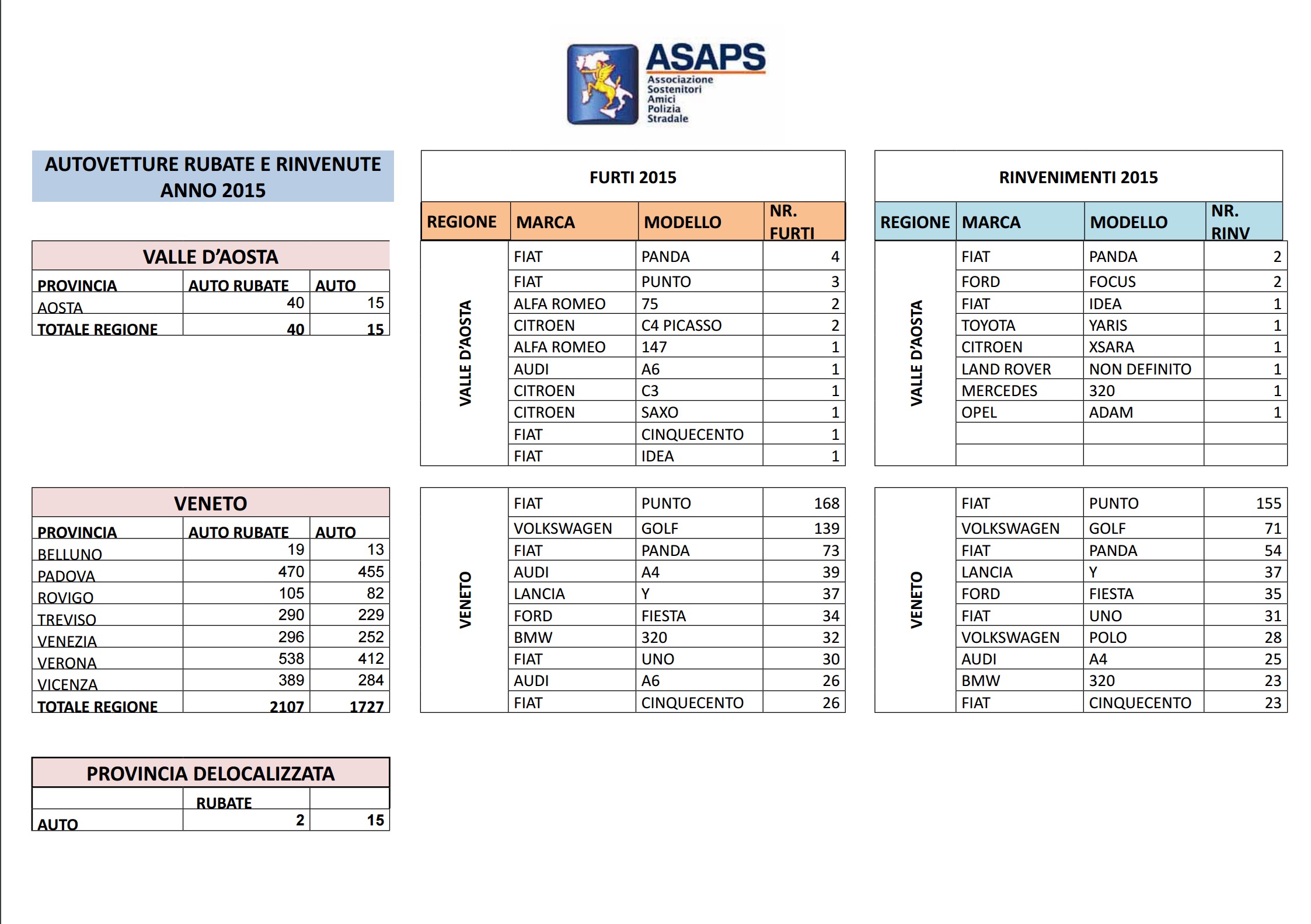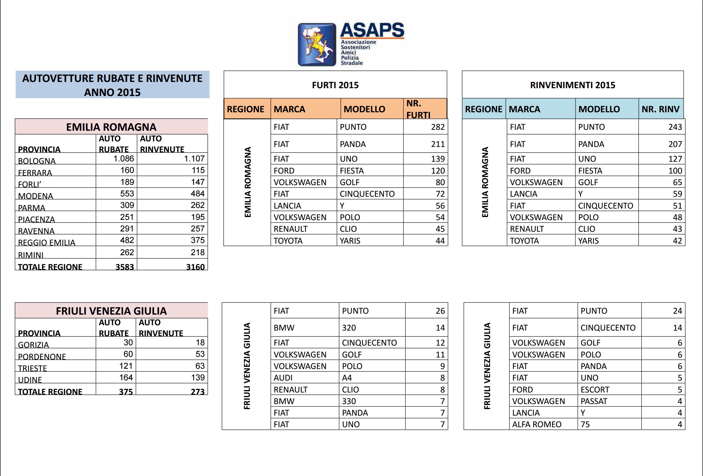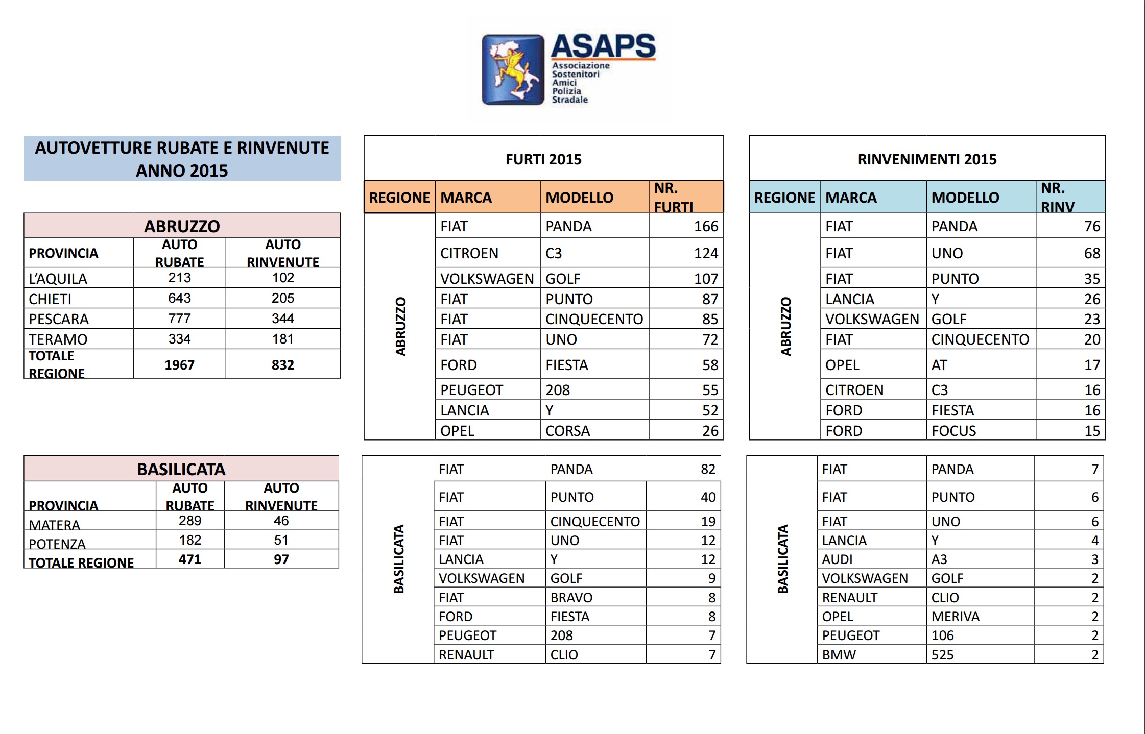 Clicca per saperne di più: Statistiche Asaps sulle auto rubate nel 2015: regioni, città, modelli e marche – Auto rubate in Italia nel 2015: i dati complessivi Asaps