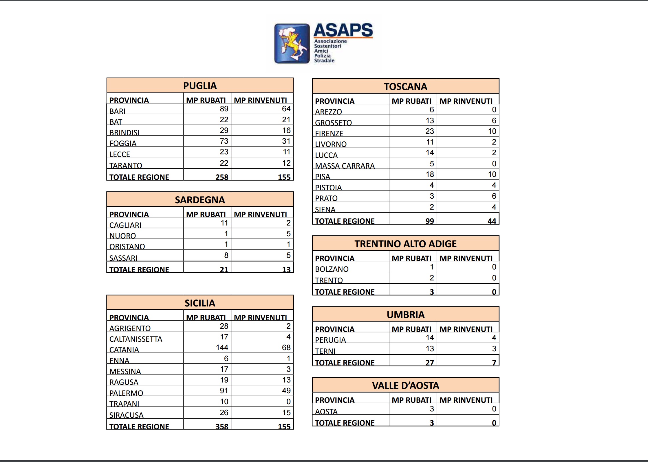 Nella classifica regionale delle sottrazioni svetta la Campania con 22.681 episodi criminali registrati, seguita dal Lazio (19.843), Puglia (17.075), Lombardia (17.008), Sicilia (16.781), mentre le meno soggette al fenomeno sembrano essere il Trentino Alto Adige con soli 176 casi, Friuli Venezia Giulia (456) e Umbria (521).