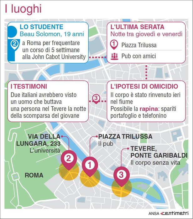 ROMA – Beau Solomon è stato derubato, spintonato, colpito con un calcio e con una pietra, terrorizzato da un grosso cane: gli ultimi istanti di vita dello studente americano, caduto nel Tevere dopo la mezzanotte fra il 30 giugno e il primo luglio, sono stati un inferno.