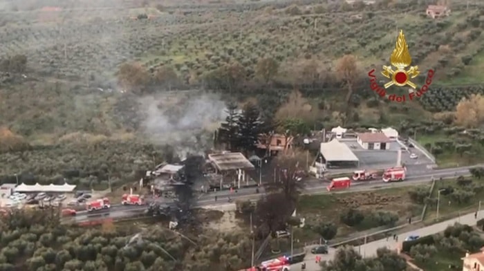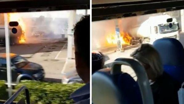 Esplosione talmente violenta che l’autocisterna e un mezzo dei vigili del fuoco sono stati sbalzati per una decina di metri finendo in una strada adiacente al distributore.