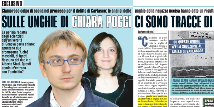 Giallo cita la nuova perizia, i cui risultati non sono stati ancora resi noti. Si sapeva giร che sotto le unghie di Chiara si celava un dna con cromosoma Y (quindi di un uomo) e che non appartenesse a Stasi. Ma che ci fosse anche un secondo uomo (e ancora una volta non Stasi) รจ un fatto assolutamente clamoroso.