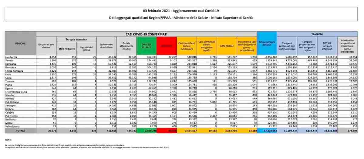 Coronavirus in Italia, il bollettino di mercoledì 3 febbraio del Ministero della Salute.