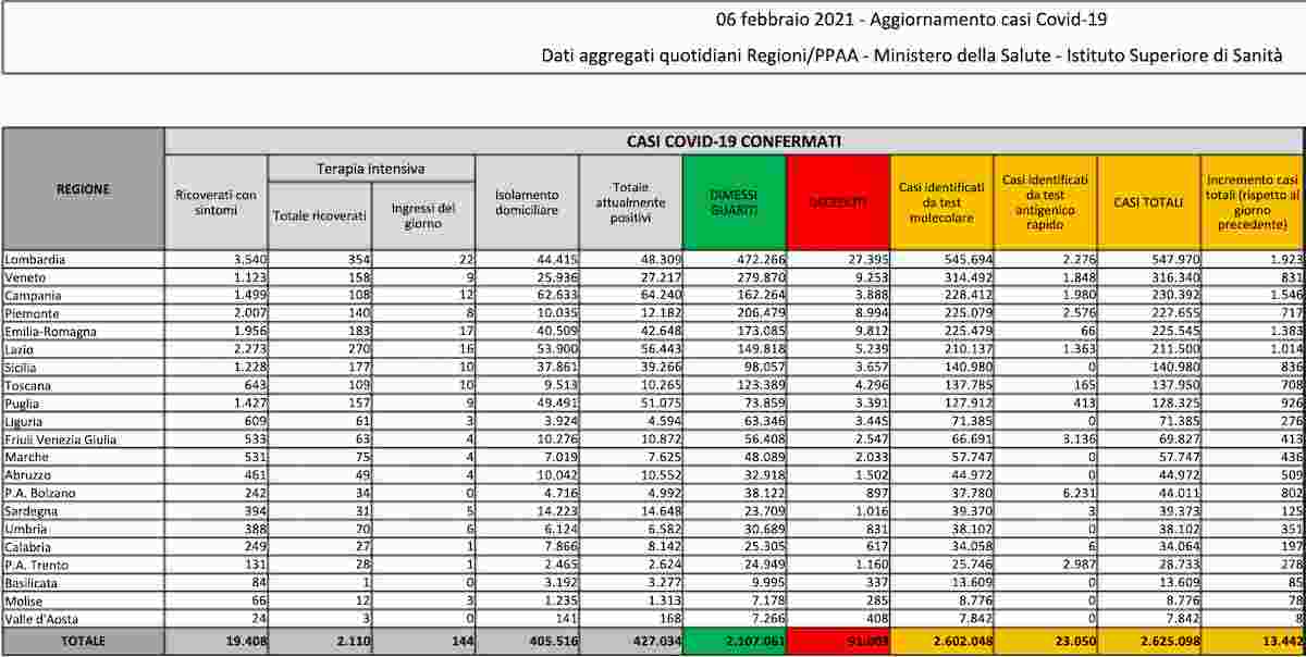Coronavirus, il bollettino del 6 febbraio 2021
