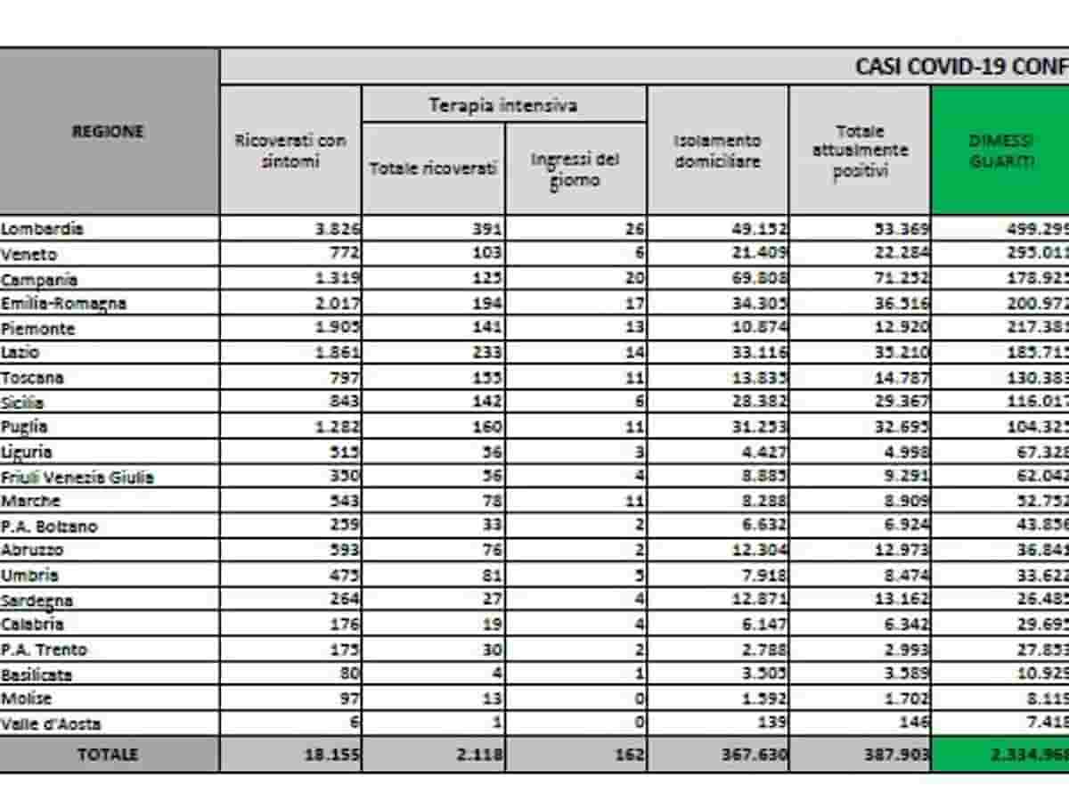 Le persone attualmente positive sono in tutto 387.948, con un aumento di 45 rispetto a ieri.
