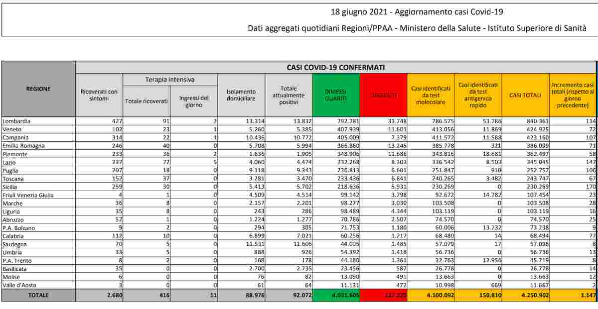 Sono 1.147 i nuovi contagi di Coronavirus riscontrati in Italia nelle ultime 24 ore secondo il bollettino del ministero della Salute, datato 18 giugno 2021. Ieri erano stati 1.325.