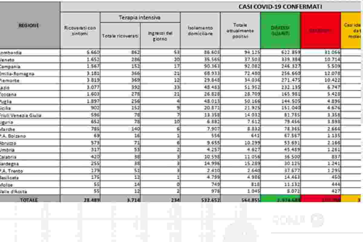 Nei reparti ordinari sono invece ricoverate 28.489 persone, in calo di 215 unità rispetto a ieri.