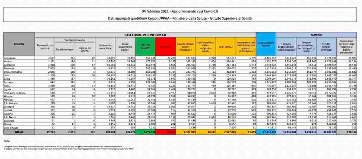 Coronavirus, il bollettino di oggi giovedì 4 febbraio con i dati forniti dal Ministero della Salute.