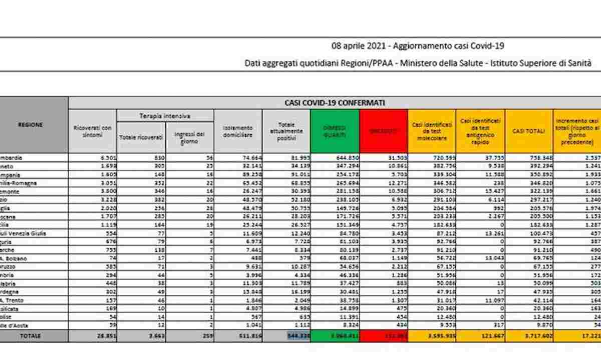 Coronavirus Italia, il bollettino dell'8 aprile 2021