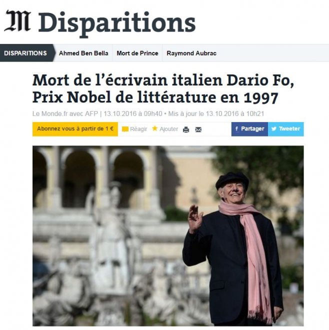 Lo scrittore è morto il 13 ottobre, un premio Nobel che se ne va proprio nel giorno del premio Nobel alla Letteratura 2016, che ha incoronato il cantautore Bob Dylan tra le proteste e i dubbi degli scrittori. Fo si è spento dopo 12 giorni di ricovero in ospedale a causa di un peggioramento della malattia polmonare che lo affliggeva da tempo. Al suo fianco il figlio Jacopo e i suoi collaboratori, con cui si intratteneva, sempre sostenendo che “non si può evitare di invecchiare, ma si può evitare di diventare vecchio”, una massima a cui si è sempre attenuto. Il figlio Jacopo ha raccontato: