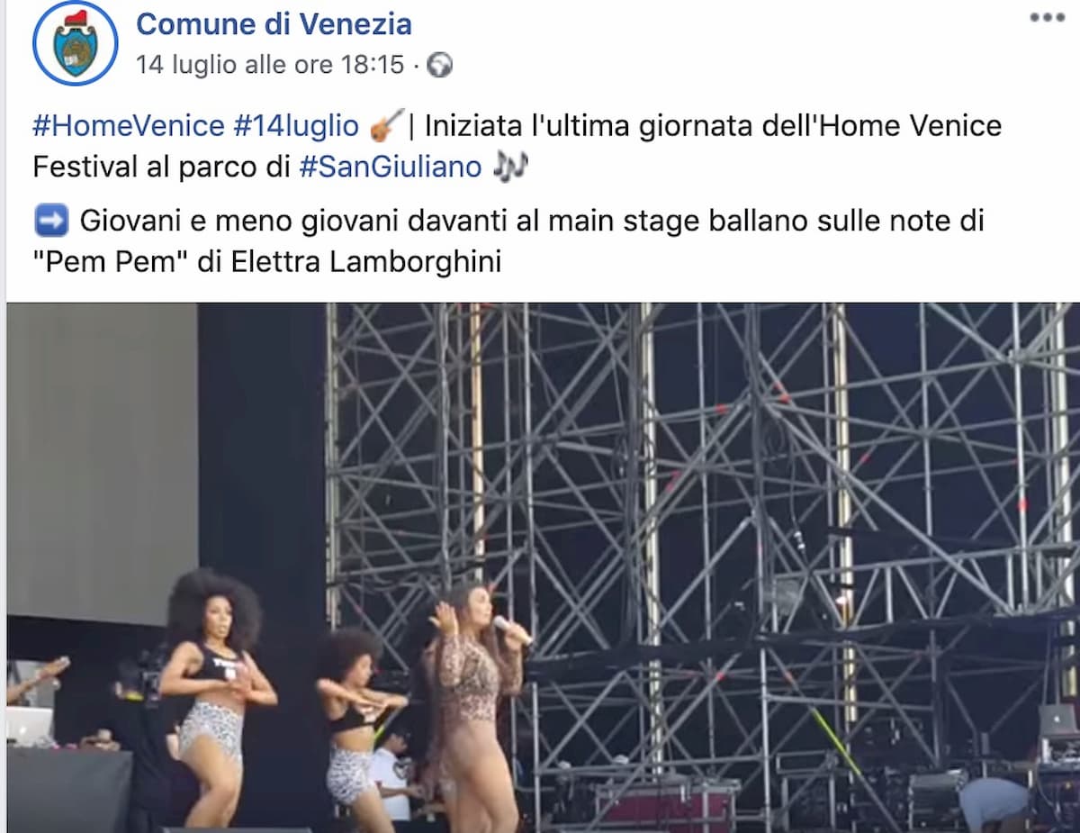 Il Comune di Venezia ha pubblicato diversi video di esibizioni del Festival, tra cui, appunto, quello di Elettra Lamborghini. Apriti cielo. Molti i commenti di rimprovero, di biasimo, di critiche a quella decisione e alla decisione stessa di far esibire la cantante sul palco.