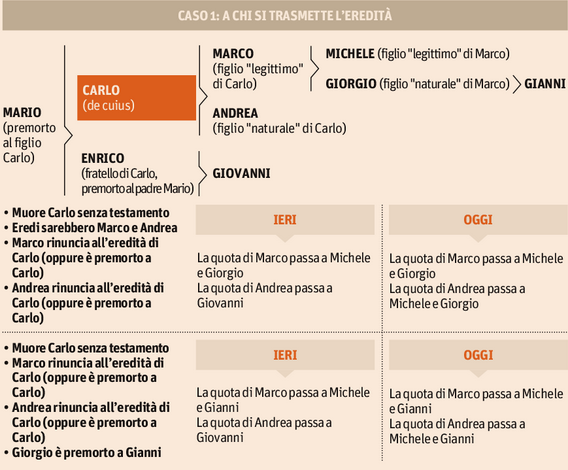 Rappresentazione. Questo è un istituto giuridico che agisce quando il “primo chiamato” in linea ereditaria, non può o non vuole accedere alla successione dei beni. Chi è il suo “rappresentante”? Facciamo il caso di due figli, Tizio e Caio, ammessi alla successione ereditaria del padre Primo. Se anche Caio è morto, a Tizio spetta la metà, ai due figli di Caio (Caio e Cietta) spetta un quarto ciascuno. Con l’equiparazione dei figli, sono ammessi anche Caietto e Caietta anche se il padre Caio era figlio “naturale”, concepito fuori da matrimonio.