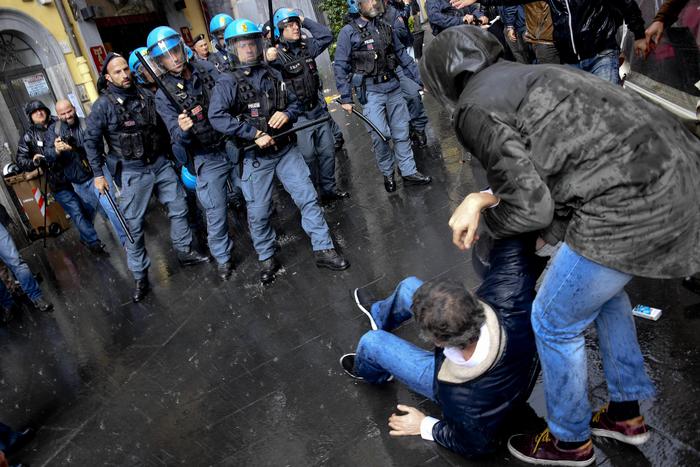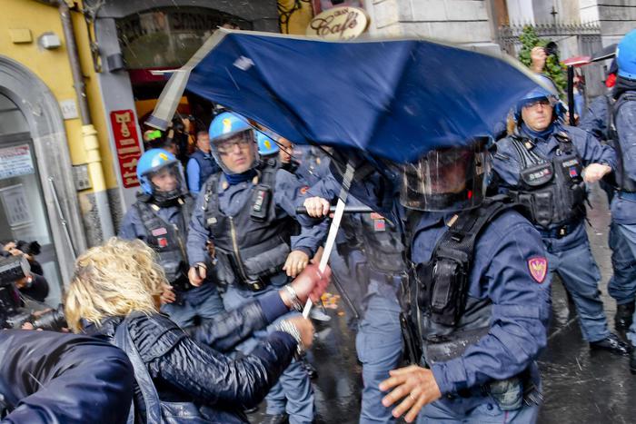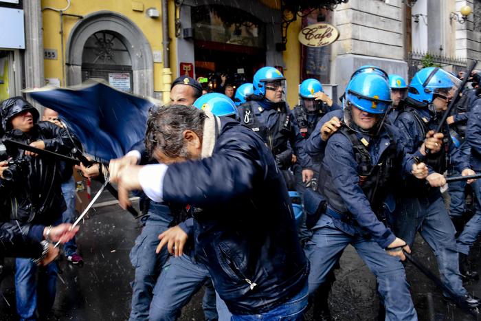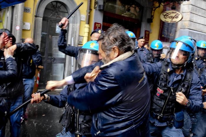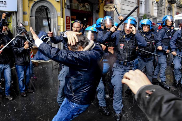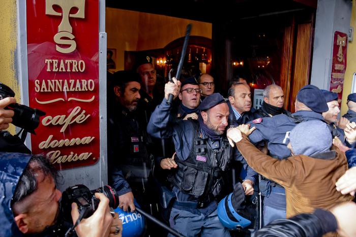 La situazione è degenerata quando i manifestati si sono avvicinati all’entrata e uno di loro avrebbe strappato un manifesto del Pd, inveendo contro il partito. Nella mischia che si è creata tra i militanti Pd e i disoccupati in rivolta si è inserita la barriera della polizia, che ha respinto i disoccupati con i manganelli. La pressione dei manifestanti sul cordone di polizia è cresciuta, dagli spintoni si è passati al contatto fisico con colpi di manganelli da parte degli agenti e di oggetti contundenti da alcuni manifestanti. Il tutto sotto gli occhi sbigottiti di passanti e turisti: la sede del Teatro Sannazaro è in via Chiaia, nel cuore del salotto buono della città.