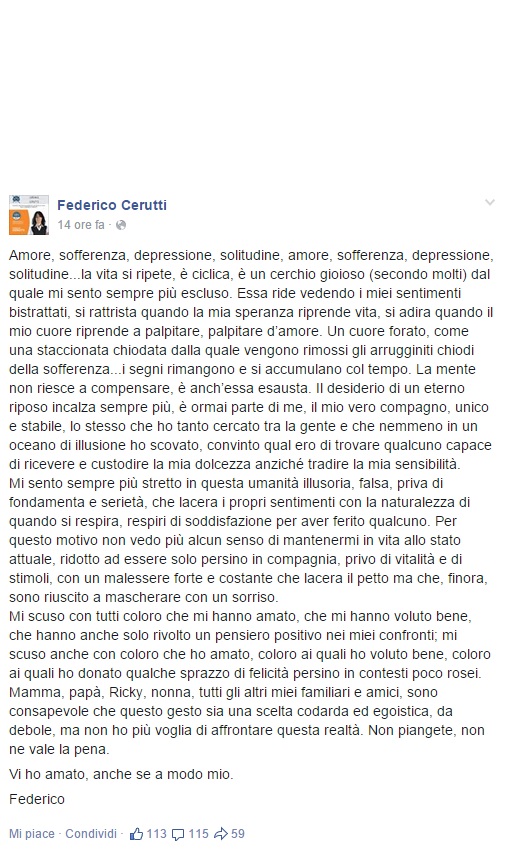 Mi scuso con tutti coloro che mi hanno amato, che mi hanno voluto bene, che hanno anche solo rivolto un pensiero positivo nei miei confronti; mi scuso anche con coloro che ho amato, coloro ai quali ho voluto bene, coloro ai quali ho donato qualche sprazzo di felicitร persino in contesti poco rosei. Mamma, papร , Ricky, nonna, tutti gli altri miei familiari e amici, sono consapevole che questo gesto sia una scelta codarda ed egoistica, da debole, ma non ho piรน voglia di affrontare questa realtร . Non piangete, non ne vale la pena.