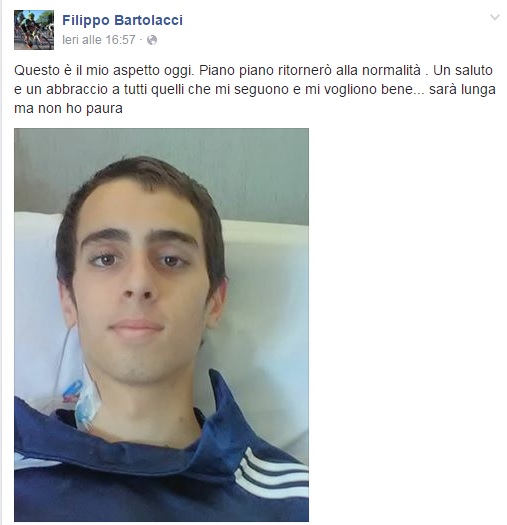 ANCONA – “Questo è il mio aspetto oggi. Piano piano ritornerò alla normalità. Un saluto e un abbraccio a tutti quelli che mi seguono e mi vogliono bene…sarà lunga ma non ho paura”. A scriverlo sulla sua pagina Facebook è Filippo Bartolacci, il sedicenne ciclista di Treia nelle Marche che nel maggio scorso è stato vittima di un terribile incidente stradale mentre si stava allenando insieme ai suoi compagni di squadra. Le condizioni del ragazzo, che è stato anche in coma farmacologico, sono migliorate ed ora è fuori pericolo. È stato lui stesso ad annunciarlo con un post scritto dal letto dell’ospedale.