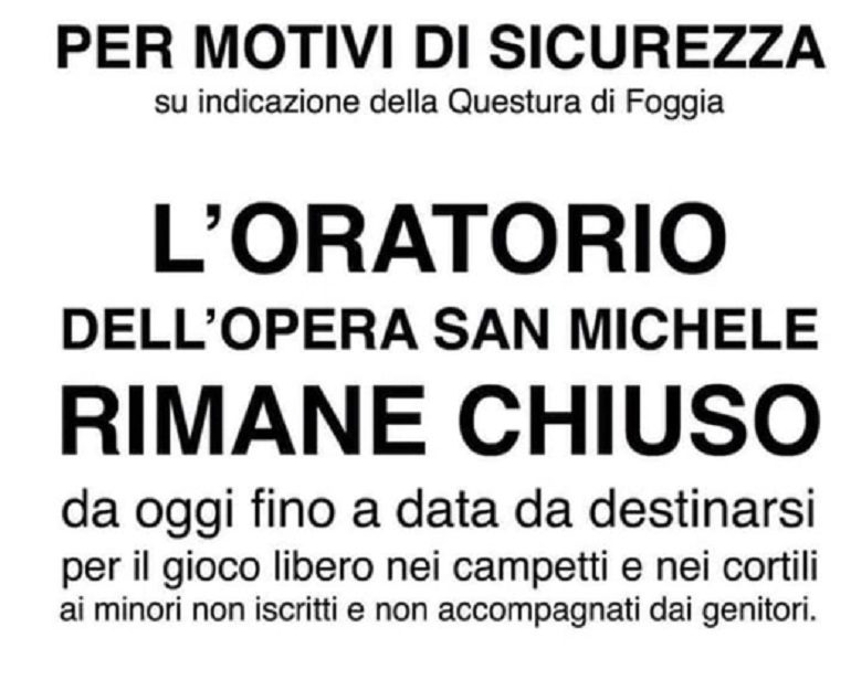ROMA – Pallonate contro i fedeli che andavano a messa e insulti a ragazzino disabile: sono tra i ripetuti “atteggiamenti violenti e spregiudicati”, da parte di un gruppo di adolescenti che hanno indotto il parroco della chiesa di San Michele di Foggia a chiudere l’oratorio. Padre Giuseppe lo ha fatto affiggendo un cartello all’esterno della struttura le cui attività” ludico-ricreative – spiega – non finiranno del tutto, ma resteranno limitate solo ai ragazzini che frequentano il catechismo e a coloro che ne condividono i valori”.