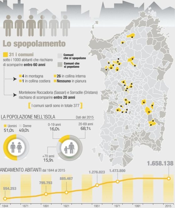 L’isola si sta spopolando nelle sue aree interne. Solo in 99 Comuni su 377 sono aumentati i residenti: tutti nelle zone costiere. Nei restanti 276 gli abitanti stanno diminuendo e in particolare in 31 fra qualche decina di anni non ci sarà più un’anima. I primi a “morire” potrebbero essere Monteleone Rocca Doria (107 abitanti in provincia di Sassari) e Sorradile (402 residenti, Oristano).