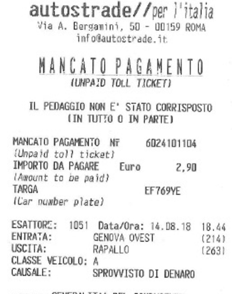 Sul web circola anche una ricevuta rilasciata al casello di Rapallo a una ambulanza della Croce Bianca della località ligure alle 18,44 del 14 agosto, poco più di sette ore dopo il disastro del Ponte Morandi. Il conducente, si legge sullo scontrino, non aveva pagato i 2 euro e 90 centesimi di pedaggio e nella ricevuta viene intimato di provvedere entro 15 giorni dalla data del transito.