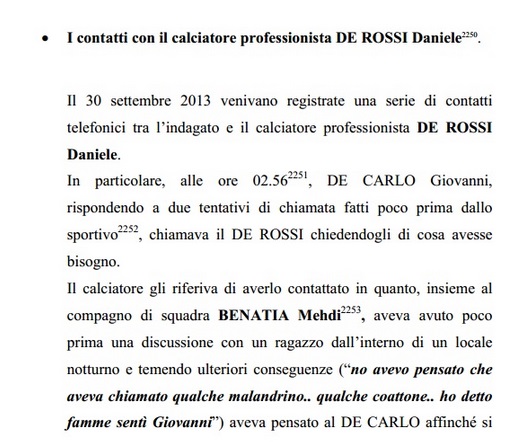 Nelle intercettazioni Daniele De Rossi si rivolge a "Giovannone" dopo una discussione in un locale. Contatti anche tra De Carlo e Giuseppe Sculli. Teo Mammuccari, sempre nei verbali, chiama De Carlo per ottenere "sostanze dopanti"