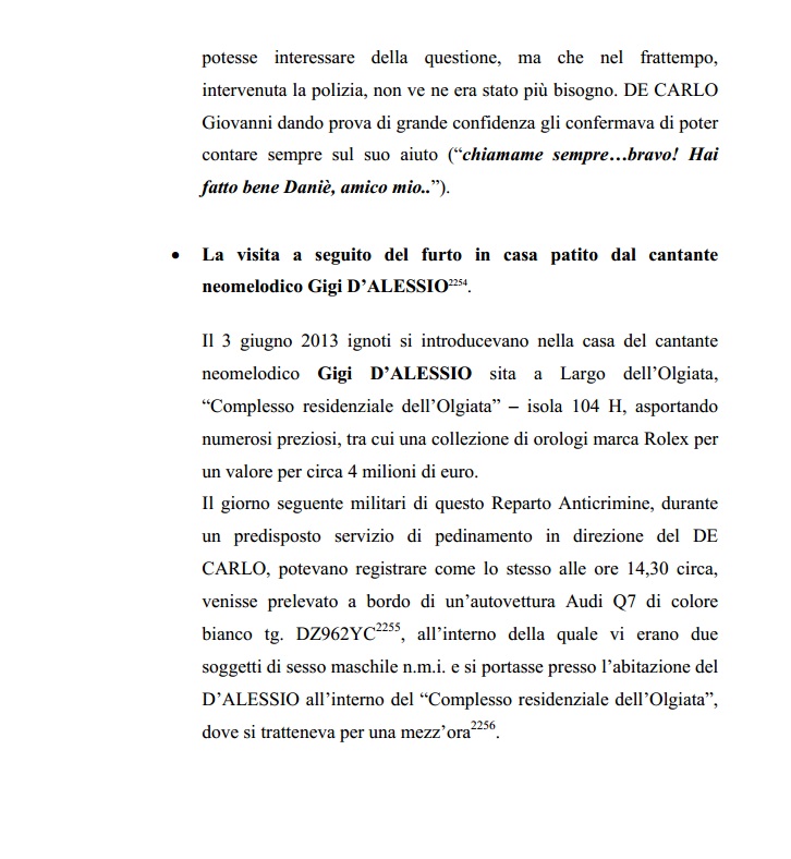 E’ sempre a Giovannone che sembra rivolgersi Gigi D’Alessio dopo che i ladri gli entrano in casa rubando una collezione di Rolex. Il cantante denuncia ma il giorno dopo, si legge nelle carte dell’inchiesta, si incontra con De Carlo e si trattiene per circa 30 minuti.