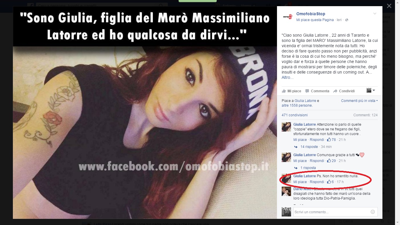 ROMA – Giulia Latorre, figlia del marò Massimiliano, è intervenuta su Radio Cusano Campus e ha parlato del suo rapporto col padre: “Con mio padre non parlo più. Abbiamo litigato, sarebbero altre cose da raccontare. Non abbiamo litigato per il coming out, ma per altre cose. Sono tantissime cose, purtroppo una persona quando si stanca di vari atteggiamenti e di varie situazioni molla tutto. Ok, la famiglia è importante quanto vuoi, di nome mi sei padre, ma di fatto? Quando mi si mettono i bastoni tra le ruote sono la prima ad andarmene”. La ragazza è intervenuta nel corso del format ECG Regione, condotto da Roberto Arduini e Andrea Di Ciancio. La ragazza ha anche detto che secondo lei gli eroi sono altri, rispetto ai marò.
