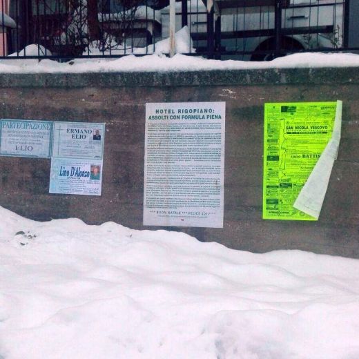 La storia della struttura e della Del Rosso, negli anni scorsi, fu segnata anche da un processo per presunto abuso edilizio conclusosi con una assoluzione a novembre, tanto che in paese e lungo la strada che porta all’hotel comparvero dei manifesti – tuttora visibili – in cui oltre agli auguri di buon Natale e felice 2017, si scriveva a chiare lettere “Hotel Rigopiano: assolti con formula piena”.