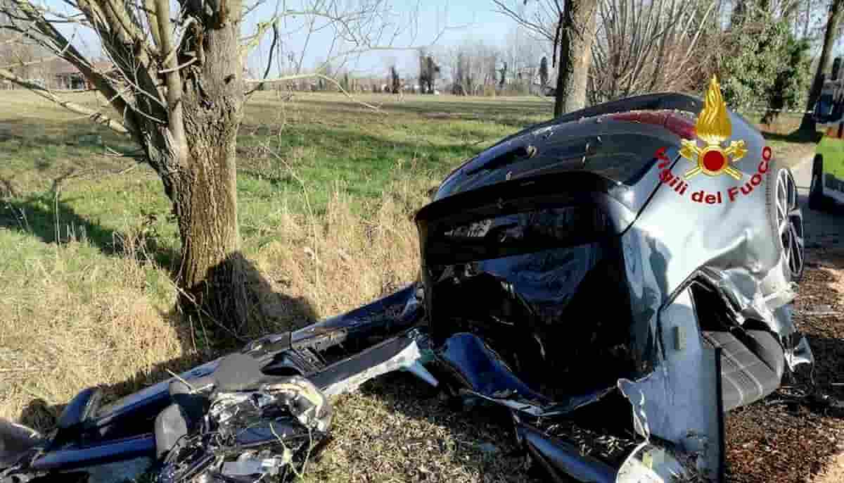 Incidente terrificante a Scorzè: auto su albero si spezza in due, morto passeggero (foto Vigili del Fuoco)