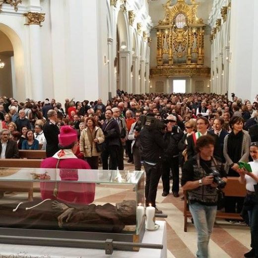 Entrato in mezzo a centinaia di persone in raccoglimento l’arcivescovo, Giuseppe Petrocchi, ha officiato una preghiera di benedizione visto che l’edificio sacro, seriamente danneggiato, è stato chiuso dal 2009. Accompagnate da un lungo applauso, le spoglie del Santo sono state portate dagli Alpini, che le avevano prelevate nella chiesa provvisoria di San Bernardino costruita in piazza D’Armi, trasportando il sarcofago su un mezzo dell’Associazione Nazionale Alpini (Ana), affidato al Gruppo Ana della frazione aquilana di Paganica.