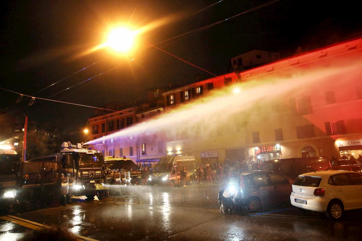 La polizia usa idranti contro il corteo dei centri sociali a Bologna (foto ANSA)