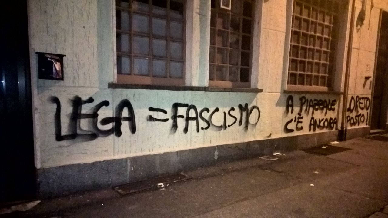 TORINO – “Lega nord e Pd uguale fascismo, c’è sempre posto a piazzale Loreto”. Un cartello “Lega fascista” e un fantoccio con la faccia di Matteo Salvini sono stati lasciati davanti alla sede della Lega nord di Torino nella notte tra il 23 e il 24 aprile. Non solo la Lega è stata presa di mira prima delle celebrazioni del 25 aprile, anche il Pd è stato accusato di fascismo nelle scritte lasciate davanti alla sede di Torino. Oltre alle scritte, davanti alla sede Pd sono apparsi un manichino con la faccia di Matteo Renzi davanti alla sede del Pd e uno di Piero Fassino.