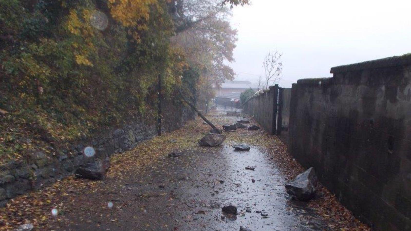 Alcuni massi caduti ingombrano la strada ad Arnad (Aosta), 23 novembre 2016. ANSA / Centrale unica del Soccorso – Regione Valle d’Aosta +++ ANSA PROVIDES ACCESS TO THIS HANDOUT PHOTO TO BE USED SOLELY TO ILLUSTRATE NEWS REPORTING OR COMMENTARY ON THE FACTS OR EVENTS DEPICTED IN THIS IMAGE; NO ARCHIVING; NO LICENSING +++