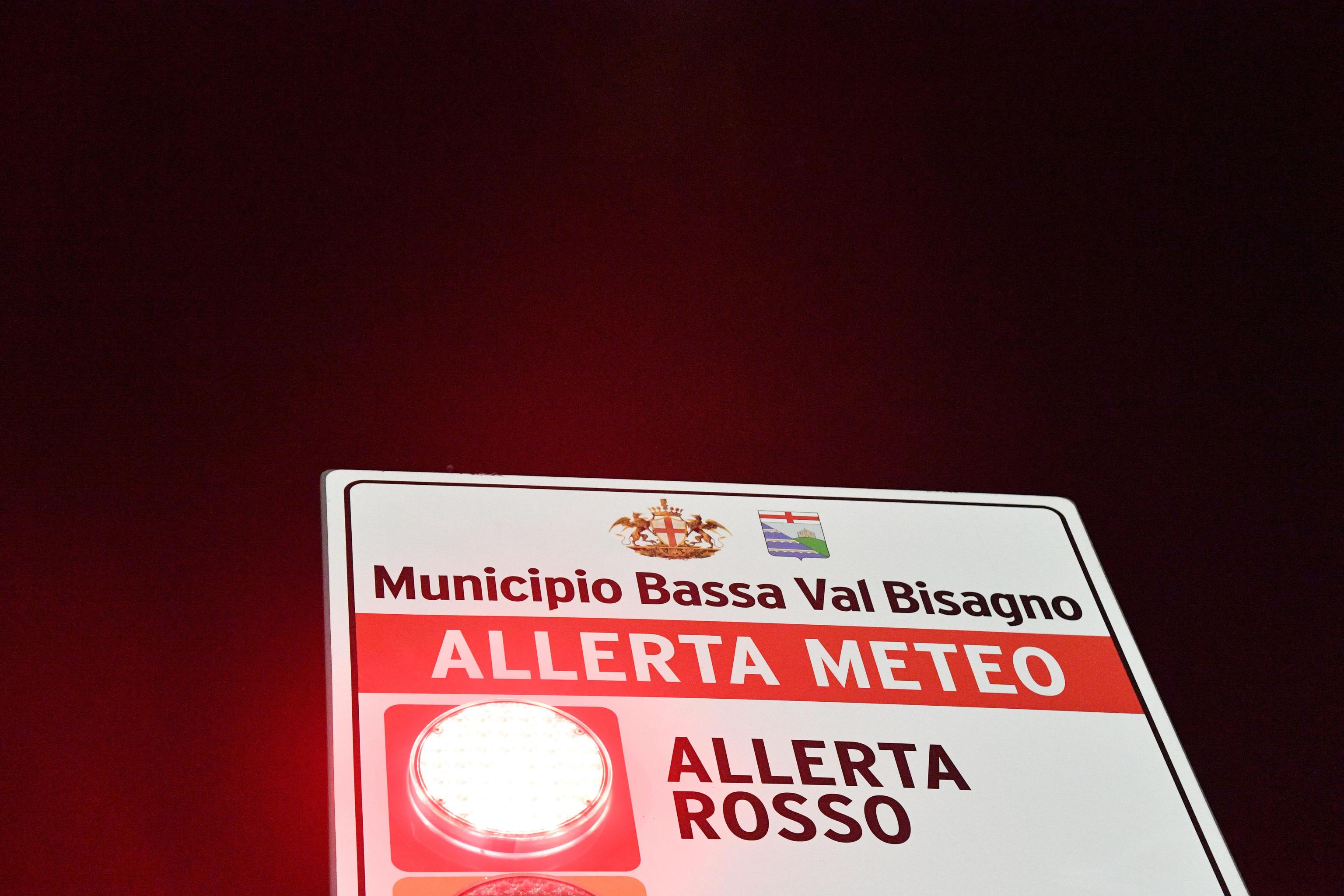Un cartello luminoso che avverte dell’allerta rossa a Genova a partire da stasera alle ore 21 fino alle 6 del 25 novembre, Genova, 23 novembre 2016.