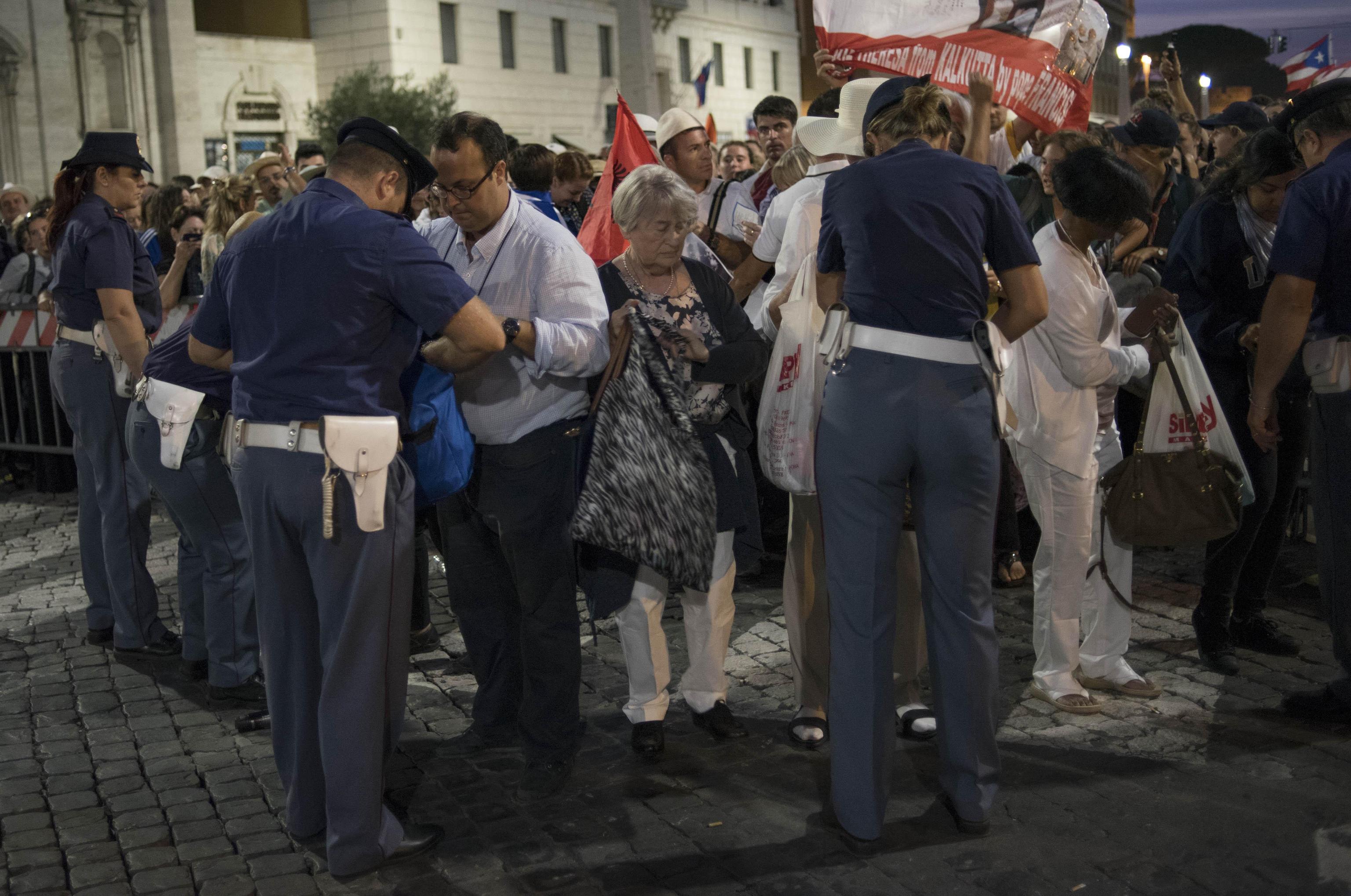 Roma blindata: caos traffico e misure di sicurezza. E’ già scattato da sabato “l’articolato” piano di sicurezza, con servizi straordinari, predisposto dalla Questura per l’evento a cui sono attesi oltre 100 mila partecipanti nonché 13 capi di Stato e di governo, tra cui il primo ministro indiano. Super presidiata l’area attorno a San Pietro e al Vaticano, come sempre considerata un obiettivo sensibile. Un fuori programma, sabato mattina, ha creato però caos nella zona. Intanto alla vigilia della cerimonia, proprio a due passi dalla basilica, si è aperta una grande voragine in via San Pio X che ha fatto parzialmente sprofondare un’edicola e creato molti disagi al traffico in zona. A causarla la rottura di una conduttura dell’acqua avvenuta nella notte. Fortunatamente nessuno è rimasto ferito. I vigili del fuoco, intervenuti sul posto, hanno rimosso l’edicola e l’hanno messa in sicurezza dall’altra parte della strada per consentire la riparazione del guasto. La stradina, tra via della Conciliazione e il lungotevere, è stata transennata e chiusa alla circolazione.