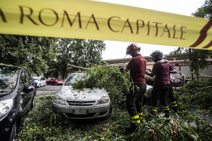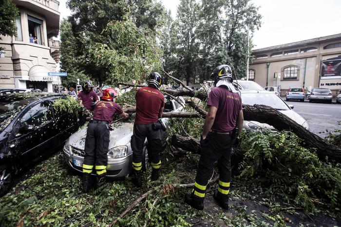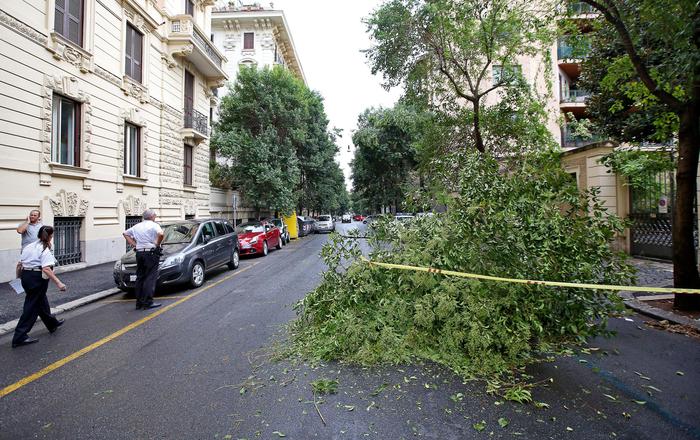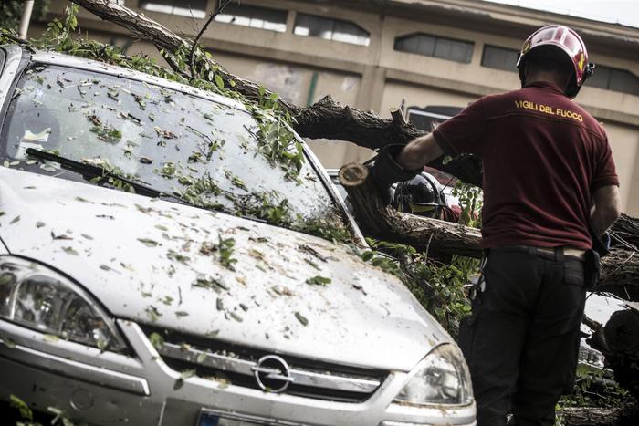 Il maltempo a Roma nella giornata di venerdì, alberi caduti su auto parcheggiate (foto Ansa):