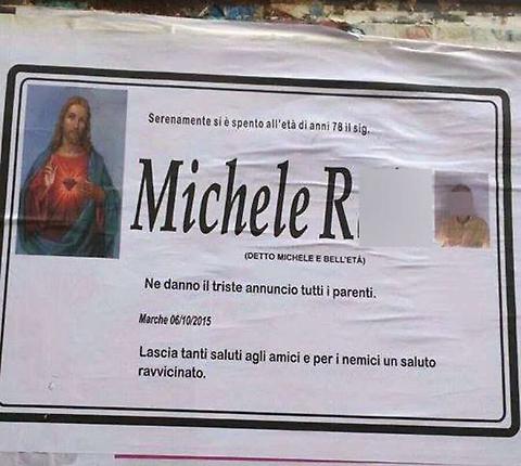 AVELLINO – Manifesti funebri sono stati affissi in tutte le strade di Mugnano del Cardinale, in provincia di Avellino, per l’ultimo saluto a Michele R.. Peccato che l’uomo, 78 anni e noto in paese per essere un burlone, non fosse affatto morto. “Volevo vedere le reazioni di parenti e amici“, ha detto il signor Michele, che nel manifesto aveva però usato una frase sibillina per sollevare qualche dubbio sulla veridicità.