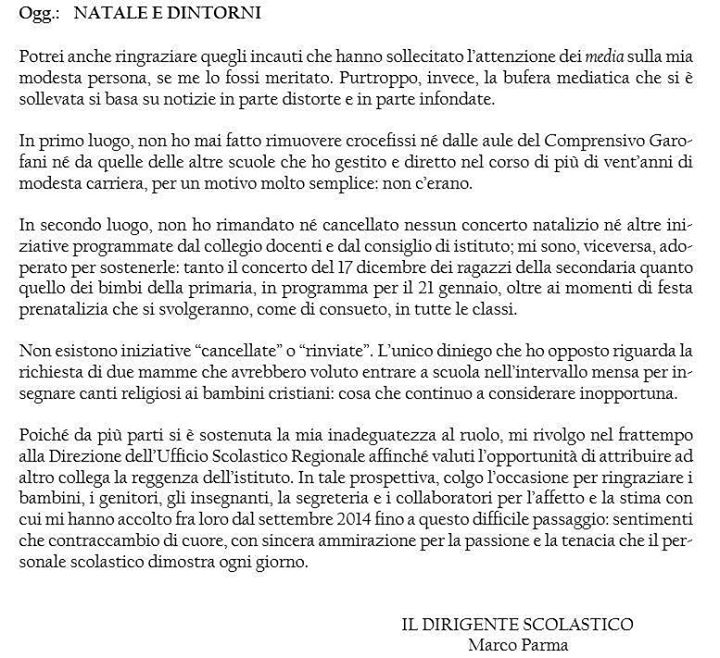 Parma sostiene inoltre di non aver “rimandato né cancellato nessun concerto natalizio né altre iniziative programmate dal collegio docenti e dal consiglio di istituto; mi sono, viceversa, adoperato per sostenerle: tanto il concerto del 17 dicembre dei ragazzi della secondaria quanto quello dei bimbi della primaria, in programma per il 21 gennaio, oltre ai momenti di festa prenatalizia che si svolgeranno, come di consueto, in tutte le classi”. Parma ha infine ringraziato “i bambini, i genitori, gli insegnanti, la segreteria e i collaboratori per l’affetto e la stima con cui mi hanno accolto fra loro dal settembre 2014 fino a questo difficile passaggio”.